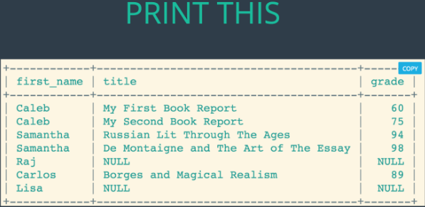 | select s.first_name, ifnull(p.title,'MISSING') as title, ifnull(p.grade,0) as grade from students s left join papers p on s.id = p.student_id; |