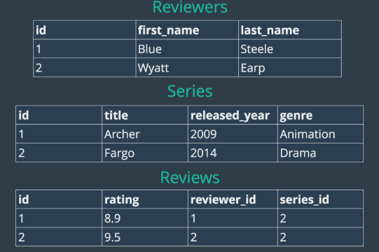 테이블 reviewer, series, reviews 상기 이미지처럼 생성 및 foreign key 적용