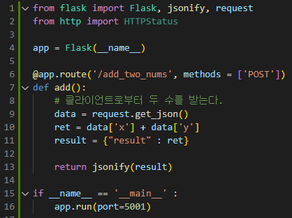 | @app.route('/add_two_nums', methods = ['POST']) def add(): # 클라이언트로부터 두 수를 받는다. data = request.get_json() ret = data['x'] + data['y'] result = {"result" : ret} return jsonify(result) |