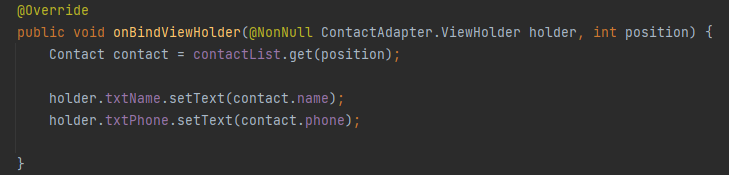 11. 생성된 뷰홀더를 화면에 보여주는 onBindViewHolder() 메서드를 구현한다. 먼저 리스트에 있는 contactList에 현재 위치에 해당하는 Contact를 하나 꺼내 contact 변수에 저장한 후 뷰홀더에 전달한다.