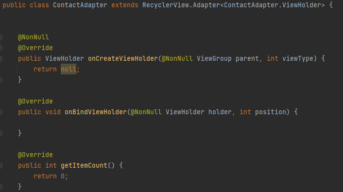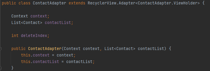 | public class ContactAdapter extends RecyclerView.Adapter<ContactAdapter.ViewHolder> { } |