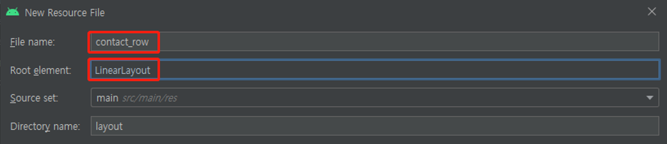 5. File name에 ‘contact_row’를, Root element에 ‘LinearLayout’을 입력하고 [OK]를 클릭해서 파일을 생성한다. 다른 값은 건드리지 않는다. 파일명은 헝가리안 표기법을 사용하지 않는다.