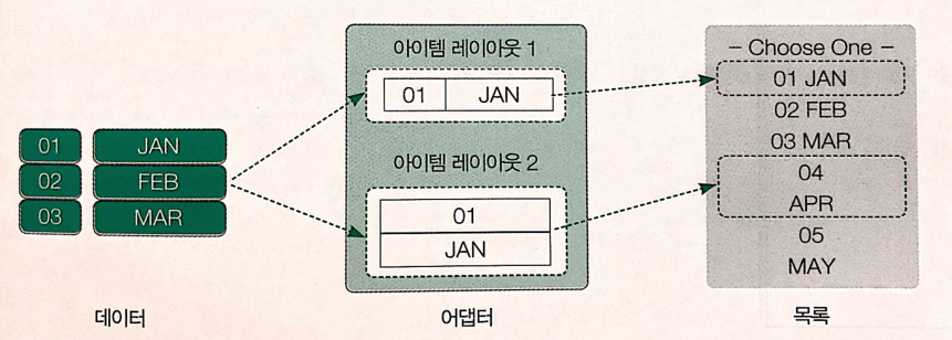 리사이클러뷰처럼 목록을 표시하는 컨테이너들은 표시될 데이터와 아이템 레이아웃을 어댑터에서 연결해주므로 어댑터에서 어떤 아이템 레이아웃을 사용하느냐에 따라 표시되는 모양을 다르게 만들 수 있다.