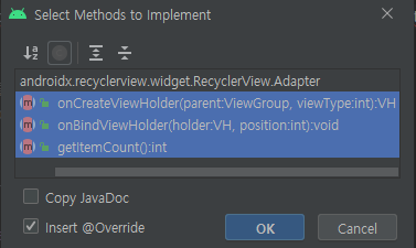상속받는 Adapter 클래스에 제네릭 뷰홀더를 지정해두면, Implement Methods로 코드를 자동 완성할 때에 자동 완성된 메서드 중 하나가 파라미터 타입에 제네릭으로 지정해둔 뷰홀더를 사용한다.