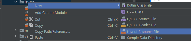 4. 여러개의 정보를 하나의 아이템에 보여줘야하니, 아이템의 레이아웃을 레이아웃 파일로 직접 생성하여 사용한다. [app]-[res]-[layout]에서 마우스 우클릭 [New]-[Layout Resource File]