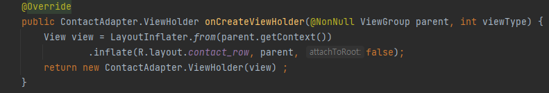 10. 이어서 onCreateViewHolder() 메서드를 구현한다. 스마트폰의 한 화면에 보이는 개수만큼 안드로이드가 이 메서드를 호출한다. 한 화면에 여덟 줄이 보이면 여덟번 호출된다. 액티비티와는 다르게 어댑터에서 사용하는 바인딩인 inflate 메서드는 3개의 파라미터가 사용된다.