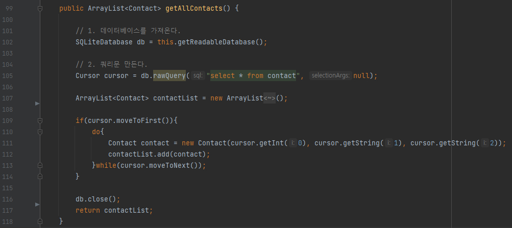 // DB 에서 주소록 데이터를 모두 가져와서, 리사이클러뷰에 표시한다.