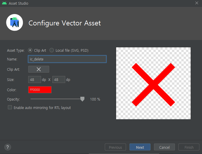 8. Name을 ‘ic_delete’로, Clip Art에는 clear로 검색하여, 하기 아이콘을, size는 48dp, color는 빨간색으로 설정하여 Next를 누르고, [app]-[res]-[drawble]에서 방금 생성한 파일을 확인한다.