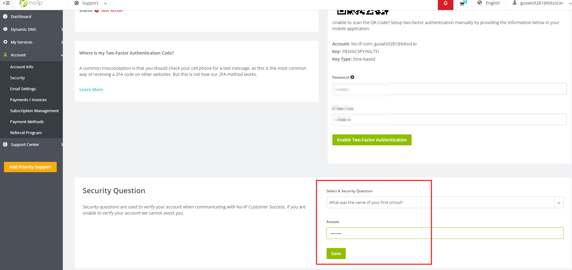 3. 보안을 위해, 질문과 답변을 설정한다.