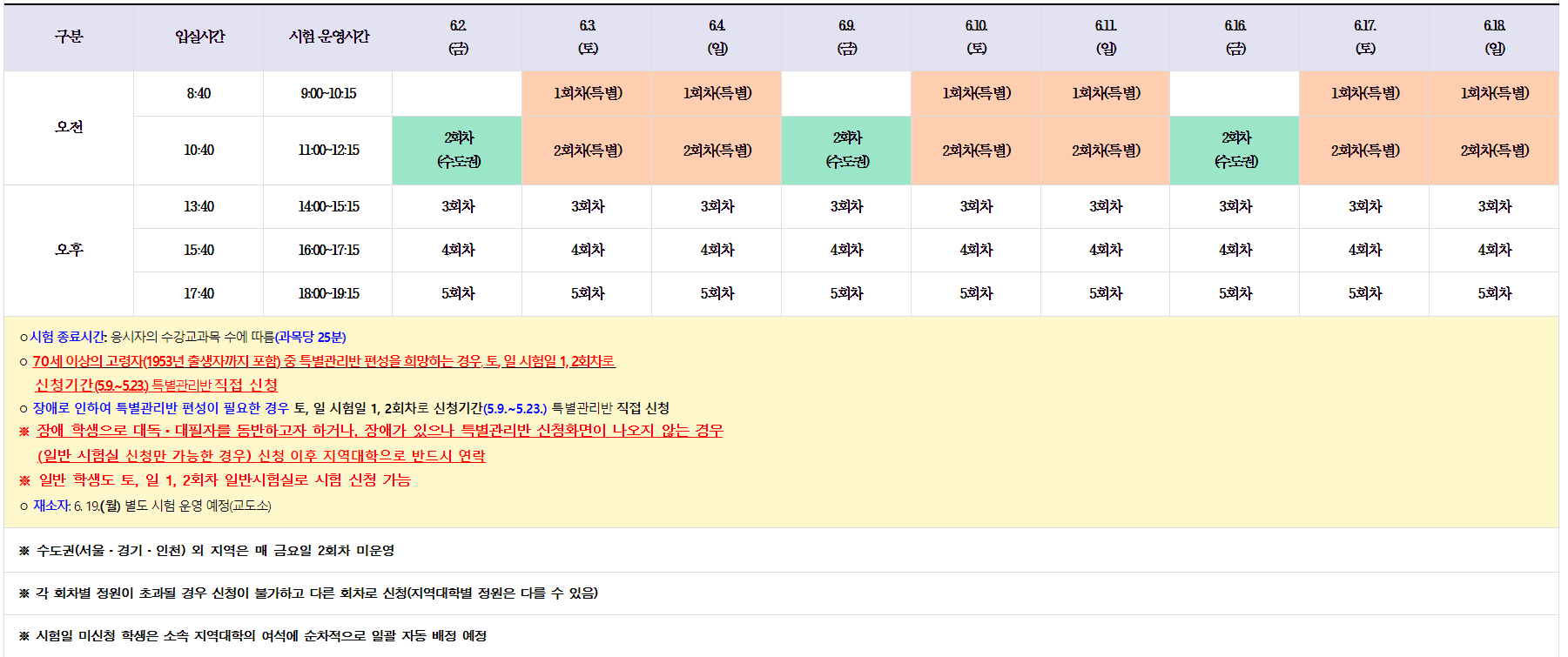 시험은 날짜별, 시간 회차별로 나누어져있다.