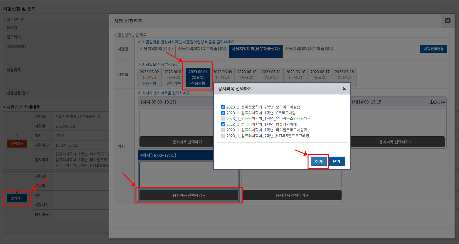 다 선택했으면, '시험신청'을 클릭한다.