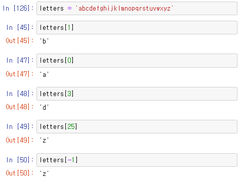 - 인덱스는 왼쪽부터 0부터 시작한다. => 컴퓨터가 자동으로 매기는 숫자(인덱스)