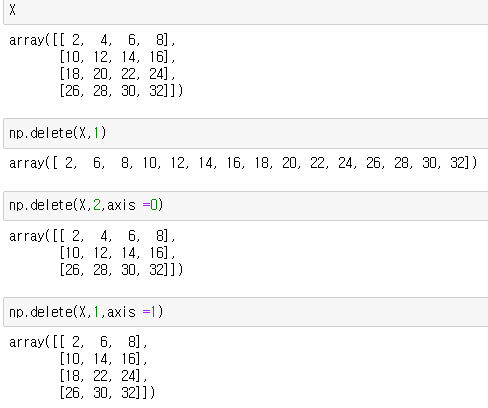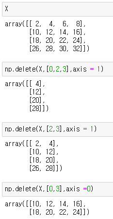 행렬에서 행/열 삭제: np.delete(넘파이 변수, 인덱스, axis = )