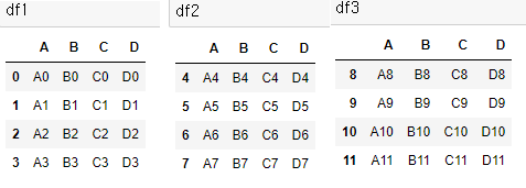 | import pandas as pd df1 = pd.DataFrame({'A': ['A0', 'A1', 'A2', 'A3'], 'B': ['B0', 'B1', 'B2', 'B3'], 'C': ['C0', 'C1', 'C2', 'C3'], 'D': ['D0', 'D1', 'D2', 'D3']}, index=[0, 1, 2, 3]) df2 = pd.DataFrame({'A': ['A4', 'A5', 'A6', 'A7'], 'B': ['B4', 'B5', 'B6', 'B7'], 'C': ['C4', 'C5', 'C6', 'C7'], 'D': ['D4', 'D5', 'D6', 'D7']}, index=[4, 5, 6, 7]) df3 = pd.DataFrame({'A': ['A8', 'A9', 'A10', 'A11'], 'B': ['B8', 'B9', 'B10', 'B11'], 'C': ['C8', 'C9', 'C10', 'C11'], 'D': ['D8', 'D9', 'D10', 'D11']}, index=[8, 9, 10, 11]) pd.concat([df1,df2,df3]) |