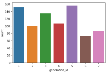 | import numpy as np import pandas as pd import matplotlib.pyplot as plt import seaborn as sb %matplotlib inline base_color = sb.color_palette()[2] sb.countplot(data = df,x = 'generation_id', color = base_color) plt.show() |