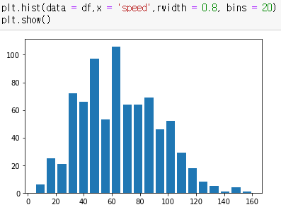 | # 1행 2열의 첫번째 차트 plt.subplot(1,2,1) plt.hist(data = df,x = 'speed', rwidth = 0.8, bins = 10) # 1행 2열의 두번째 차트 plt.subplot(1,2,2) plt.hist(data = df,x = 'speed', rwidth = 0.8, bins = 20) |