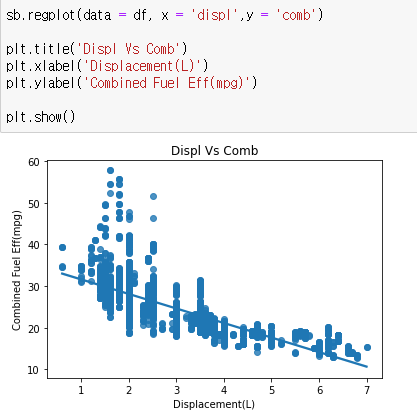 | import numpy as np import pandas as pd import matplotlib.pyplot as plt import seaborn as sb %matplotlib inline sb.regplot(data = df, x = 'displ',y = 'comb') plt.title('Displ Vs Comb') plt.xlabel('Displacement(L)') plt.ylabel('Combined Fuel Eff(mpg)') plt.show() |